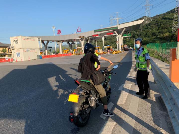 摩托车驾驶员从富阳出发准备去桐庐,导航发现从鹿山上高速到桐庐不但距离近,而且没红绿灯,然后直接骑摩托车到鹿山收费站准备上高速,面对收费站工作人员的拦截,驾驶员并不理解,表示自己车辆检验合格,证件齐全。