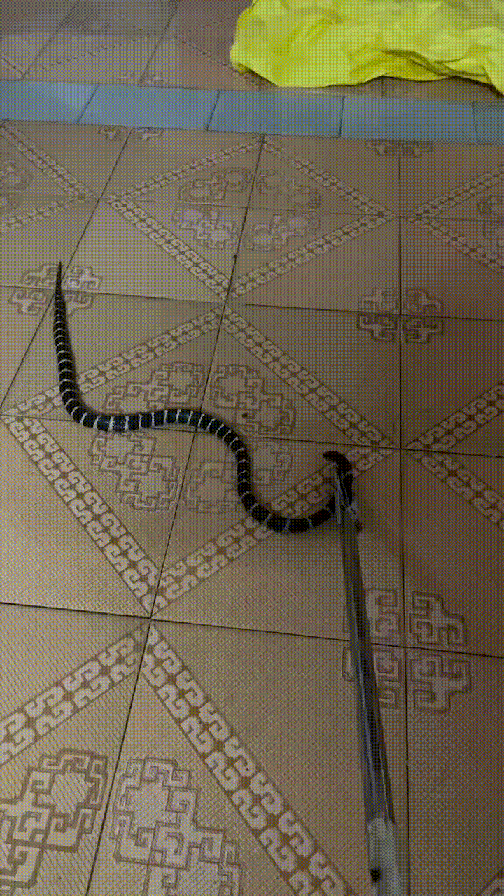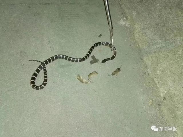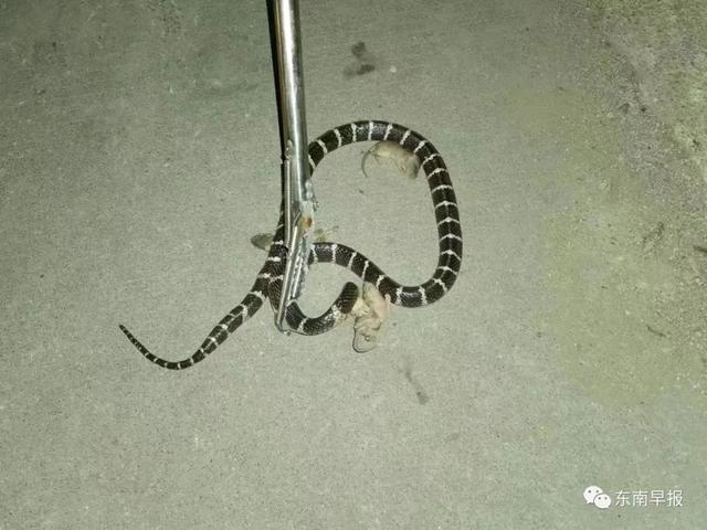 接到警情后,南安市公安局罗东派出所民警小李马上赶赴现场,只见一条1米多长的蛇死死咬住一只大老鼠,大老鼠不停地挣扎,动作幅度越来越小,旁边零零落落躺着的四只小老鼠已经一动不动。经确认,这是条银环蛇,毒性极为猛烈。民警立即使用捕蛇工具,将正在与老鼠大战的银环蛇头部夹住,迫使它与老鼠分开。此时,银环蛇估计是和老鼠打架打累了,已经没有多大力气反抗,民警将蛇放入编织袋中,随后带至附近山林放生。
