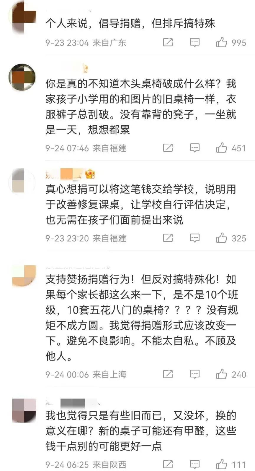 但有网友提出质疑:只给这个班级捐,其他班级怎么办?会不会引发攀比、搞特殊化;这位家长如此高调地捐桌椅,会不会对其他家长形成无形的压力,成为一种变相的“逼捐”。这些担忧,有一定的道理,但单就这件事而言,有点把问题看得太严重了。
