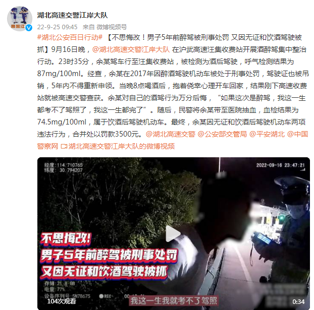 9月16日晚,@湖北高速交警江岸大队在沪武高速汪集收费站开展酒醉驾集中整治行动。23时35分,余某驾车行至汪集收费站,被检测为酒后驾驶,呼气检测结果为87mg/100ml。经查,余某在2017年因醉酒驾驶机动车被处于刑事处罚,驾驶证也被吊销,5年内不得重新申领。当晚8点喝酒后,抱着侥幸心理开车回家,结果刚下高速收费站就被高速交警查获。余某对自己的酒驾行为万分后悔,“如果这次是醉驾,我这一生都考不了驾照了,我这一生都完了”。随后,民警将余某带至医院抽血,血检结果为74.5mg/100ml,属于饮酒后驾驶机动车。最终,余某因无证和饮酒后驾驶机动车两项违法行为,合并处以罚款3500元。