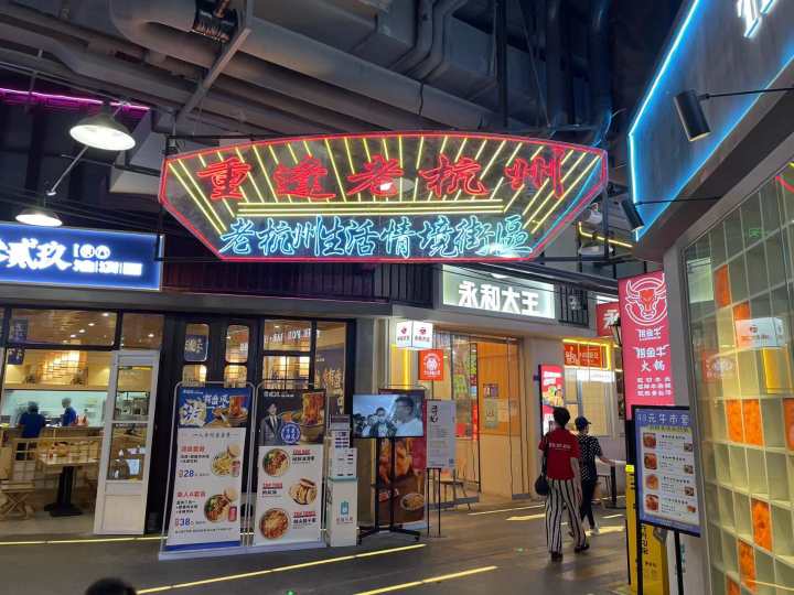 复古怀旧的装修质感、赛博朋克的霓虹灯光、杭州老街老巷、记忆中的老物件,走入“057壹号码头”地下空间,就仿佛拨通了与老杭州的时空电话,让你“瞬间穿越”到上世纪八九十年代。