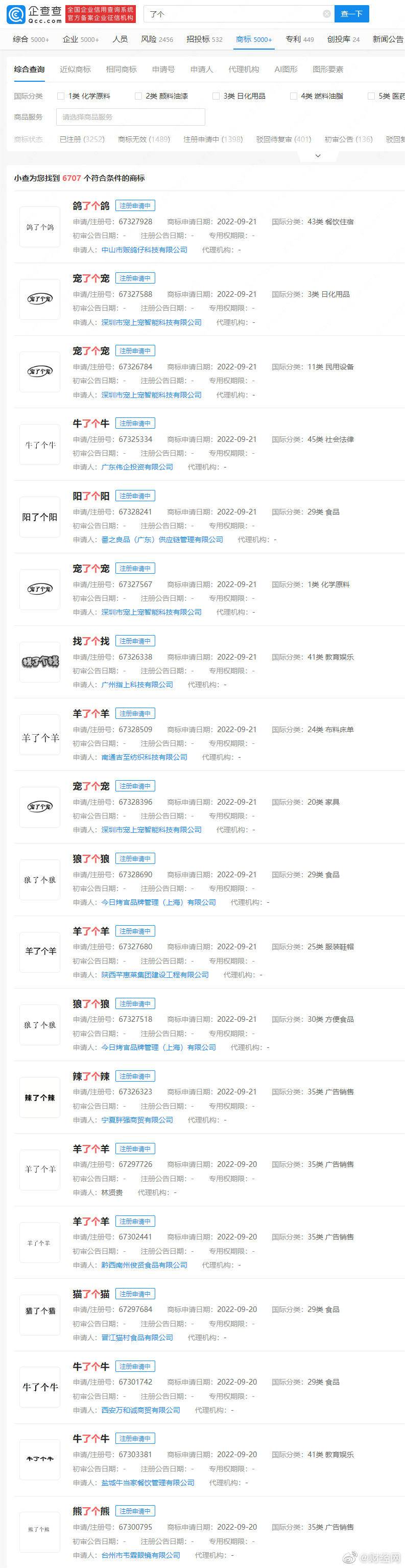 目前,在中国商标网搜索“羊了个羊”,可以搜到604个商标申请。