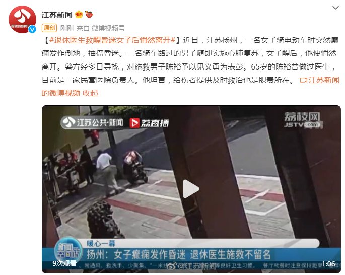 近日,江苏扬州,一名女子骑电动车时突然癫痫发作倒地,抽搐昏迷。一名骑车路过的男子随即实施心肺复苏,女子醒后,他便悄然离开。警方经多日寻找,对施救男子陈裕予以见义勇为表彰。65岁的陈裕曾做过医生,目前是一家民营医院负责人。他坦言,给伤者提供及时救治也是职责所在。