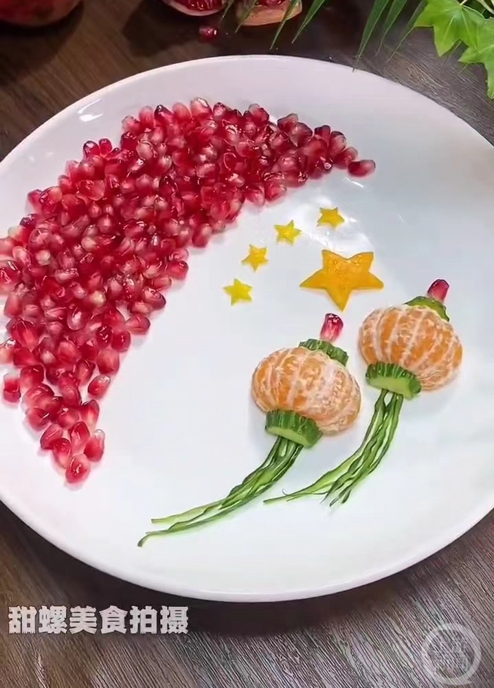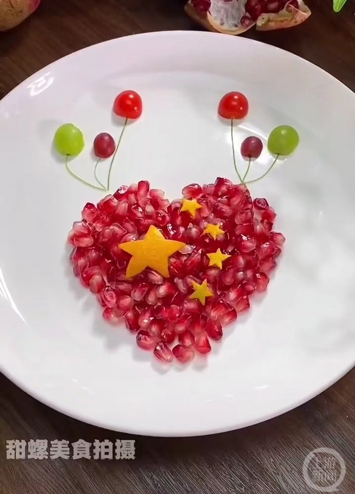甜螺博主表示:“这些点子都是我自己想的,(因为国庆节)想到了国旗、红星、花儿在阳光下茁壮成长等元素。”她坦言:“这些摆盘看起来比较复杂,其实很好制作。石榴刚好是上市的季节,另外还用了黄瓜和橘子,摆盘要好学习、好操作、好模仿,包括用到的材料也要方便,这样才能激发他人的创造能力。”