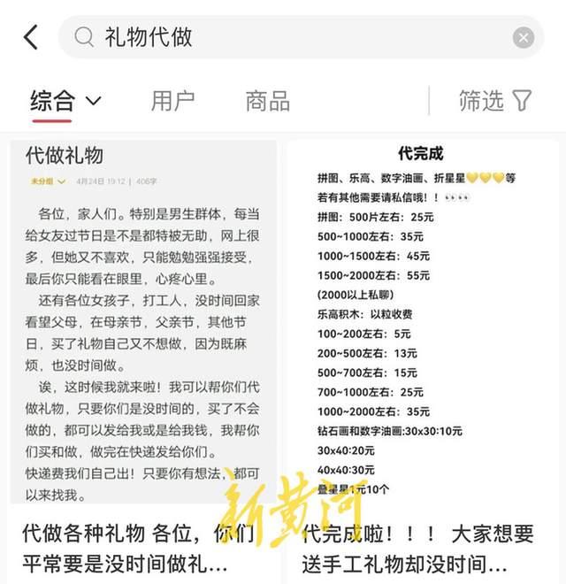 此外,还有部分网友在网络平台打出代做DIY手工的兼职。一位对外接单的博主坦言,自己可以给没时间做个性礼物的“打工人”提供礼物成品,包括但不限于拼乐高、折星星、做奶油胶手机壳、贴个性钻石画等。