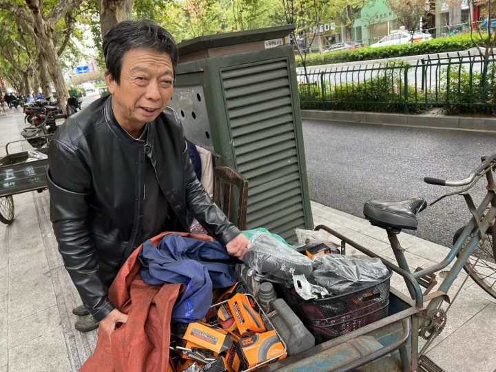 今天(11月3日)早上6点半,65岁的孙增华停下三轮车,依次把轮胎、工具等东西摆放好。