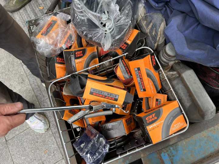 和自行车有关的配件,车胎、链条、坐凳、车铃等等都有,如果想要加车筐装菜或者书包,则需要自己带。