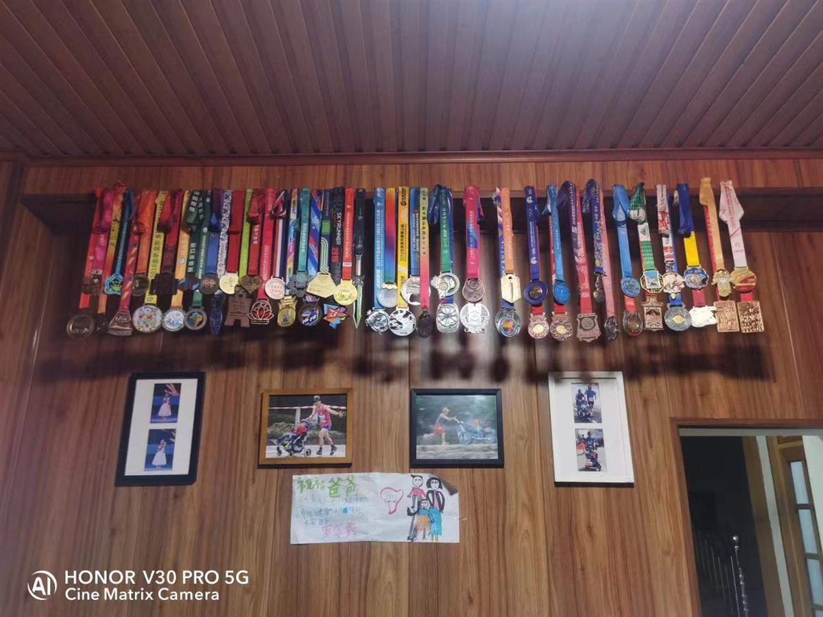 从2015年开始,罗书坚推着儿子一起在全国各地参加了53场马拉松比赛,丽水、无锡、北京、上海、武汉……父子俩到过20多个城市,最好的半程马拉松成绩是1小时33分左右。罗书坚自己还参加了5公里、10公里、铁人三项等赛事,完赛的奖牌都被他挂起,和与儿子参赛的合影、人的合影放在一起。