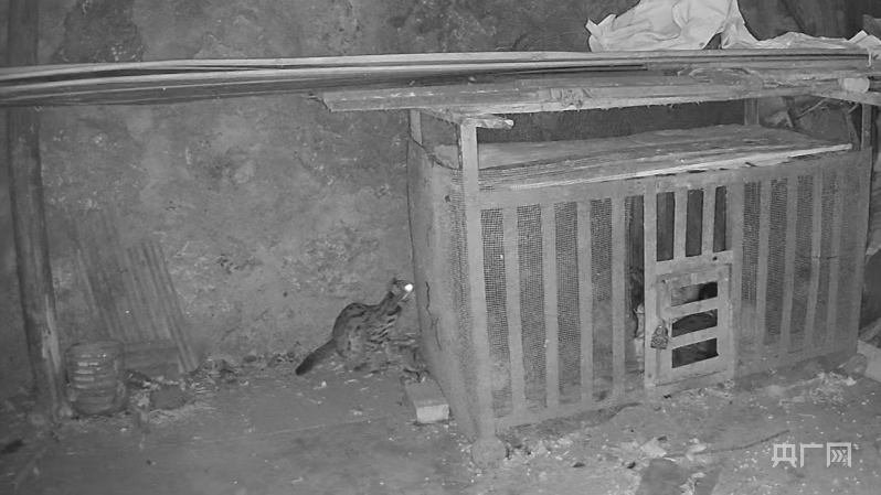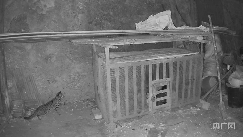 后来,张艳察看了鸡笼,鸡好好的,还在。她又把拍下的录像回看一遍,很快就发现了情况:一只似豹非豹、似猫非猫的动物闯入了镜头里,它身体细长,布满了铜钱样斑纹,眼睛像两只小手电筒,蹑手蹑脚靠近鸡笼,伸出了左脚前去试探,甚至将头伸进鸡笼与墙之间缝隙探寻,弓着身子,极为警惕,没一会儿,可能发现了异常,折身走了。整个过程不过几十秒。