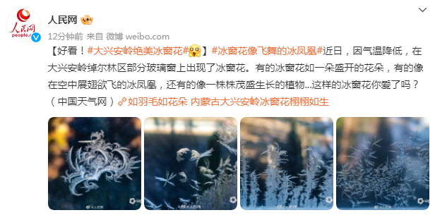 近日,因气温降低,在大兴安岭绰尔林区部分玻璃窗上出现了冰窗花。有的冰窗花如一朵盛开的花朵,有的像在空中展翅欲飞的冰凤凰,还有的像一株株茂盛生长的植物...这样的冰窗花你爱了吗?