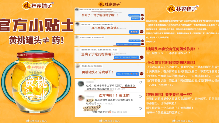 12月9日,“林家铺子食品”发布微博称,因为特殊时期,看到有些地方的粉丝开始囤积生活物品,很多也选择囤积黄桃罐头。渐渐的,出现了很多将黄桃罐头作为药的帖子,甚至收到了“你家的黄桃罐头能治病吗?”这样的私信。“林家铺子食品”称,黄桃罐头本身没有任务药效作用,请理性囤货,不要盲目跟从。