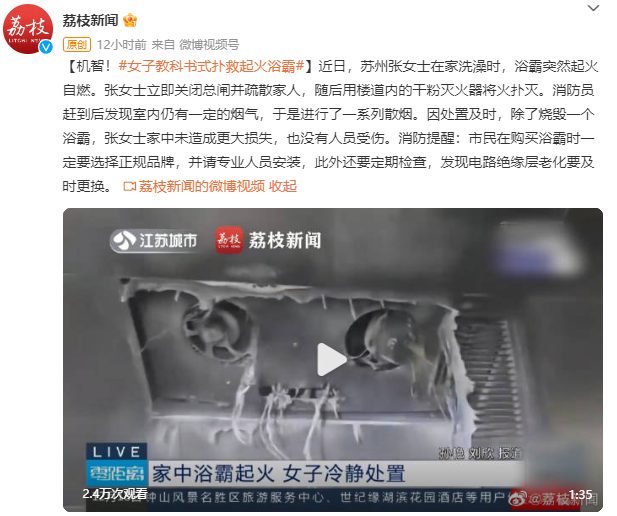 机智!女子“教科书式”扑救起火浴霸