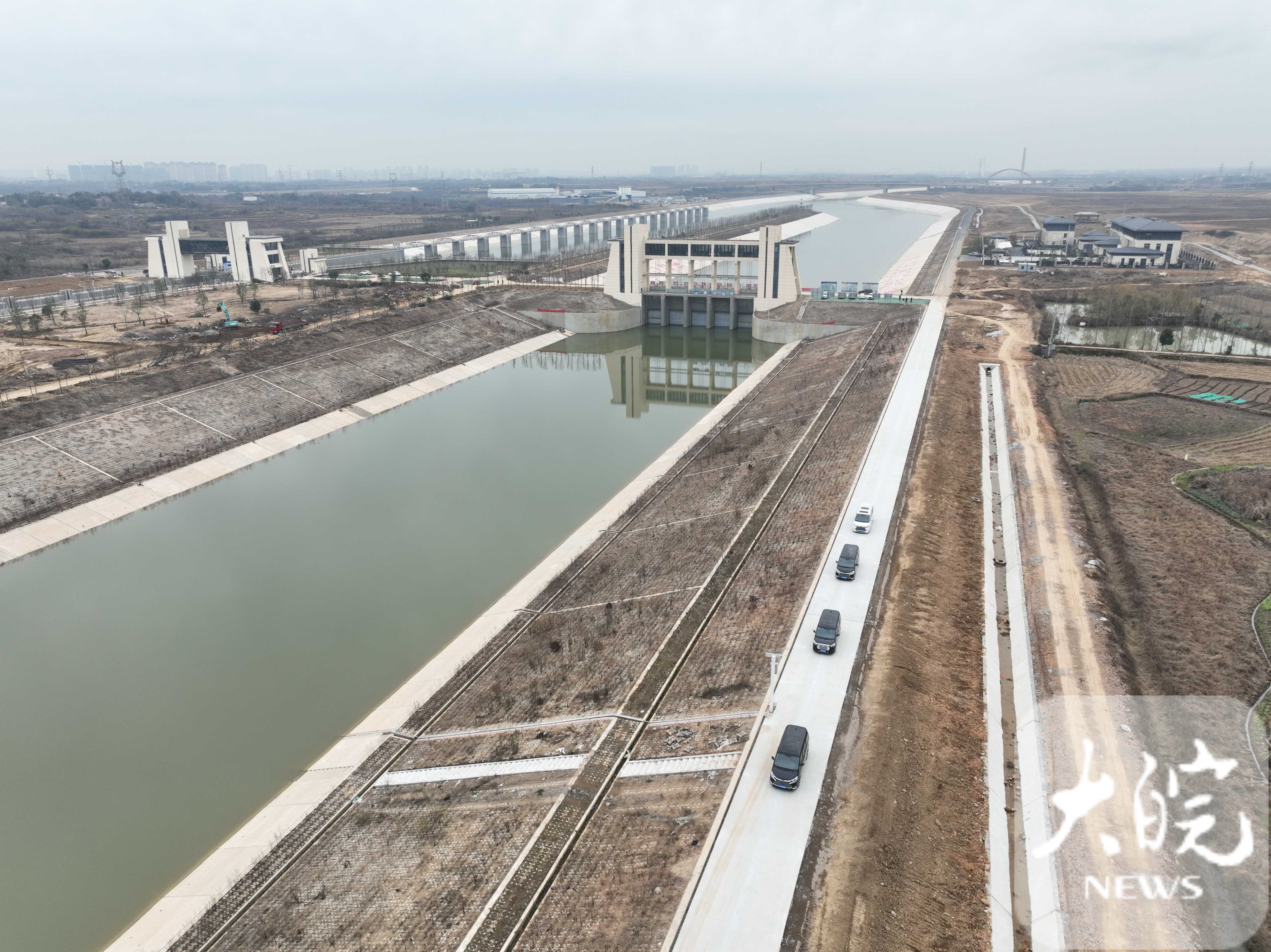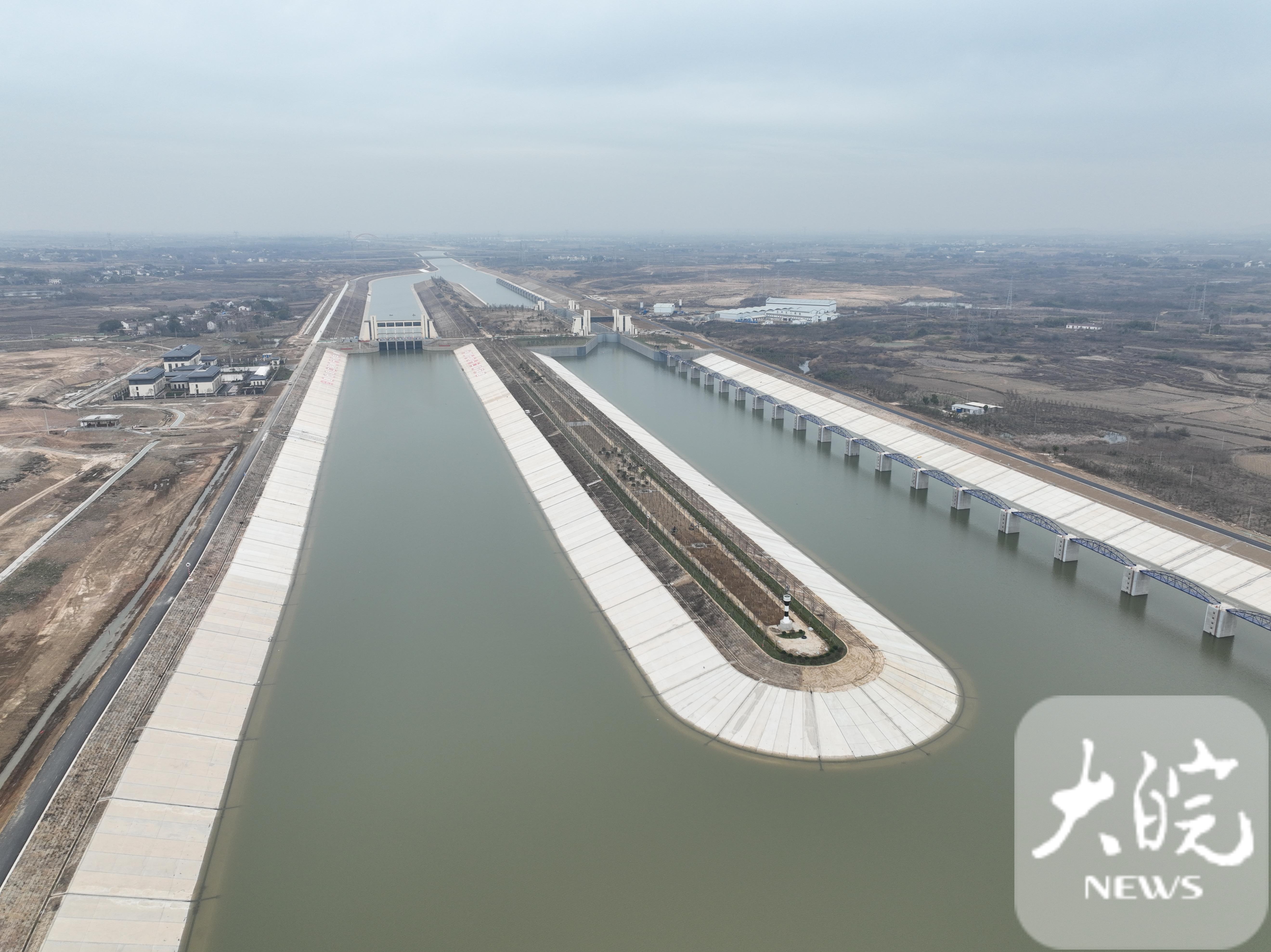 庐江节制枢纽建在菜巢分水岭上,分为节制闸和船闸,主要功能是为了满足引江济巢段菜巢线工程引水、通航、防洪等需要。