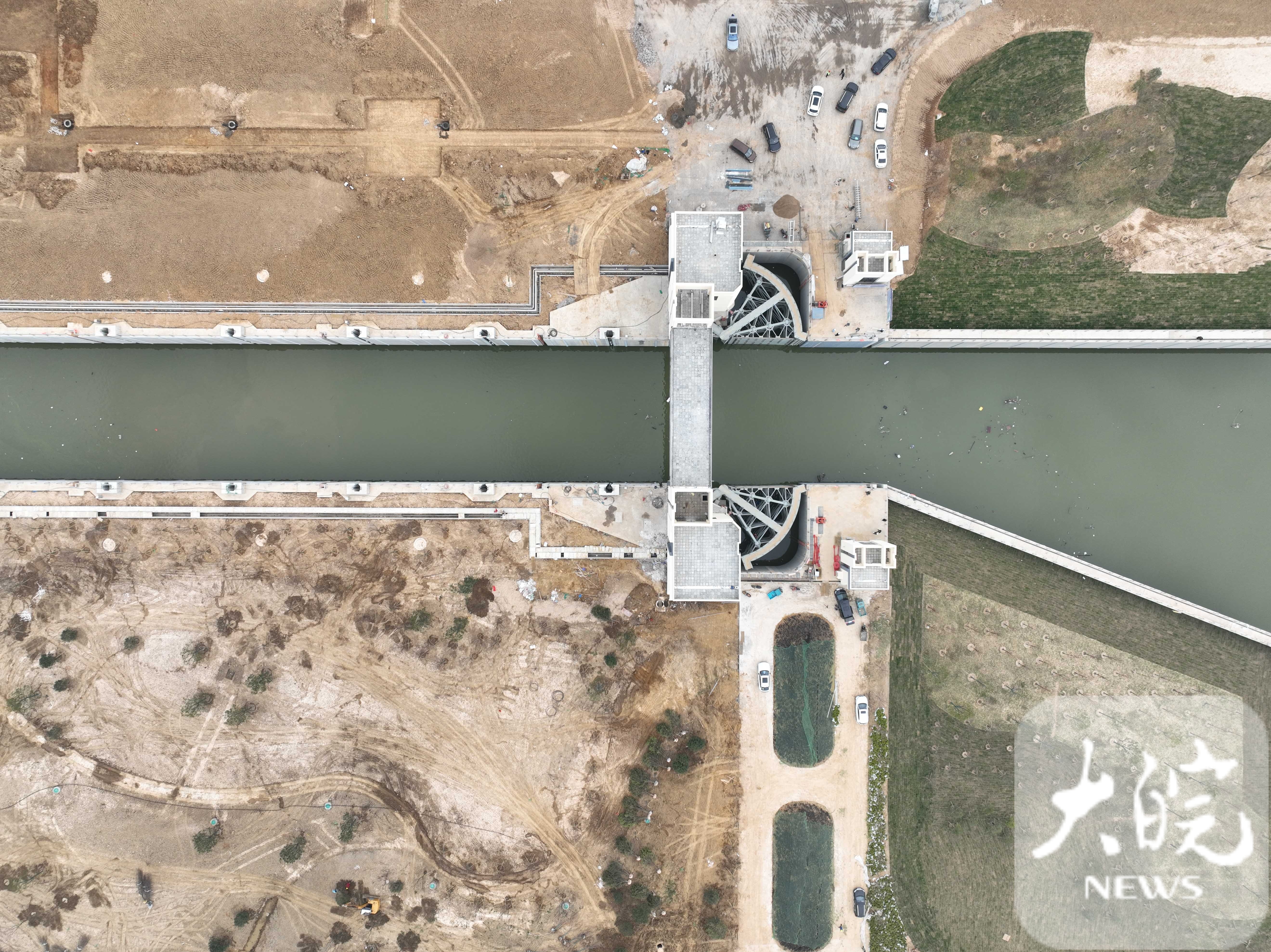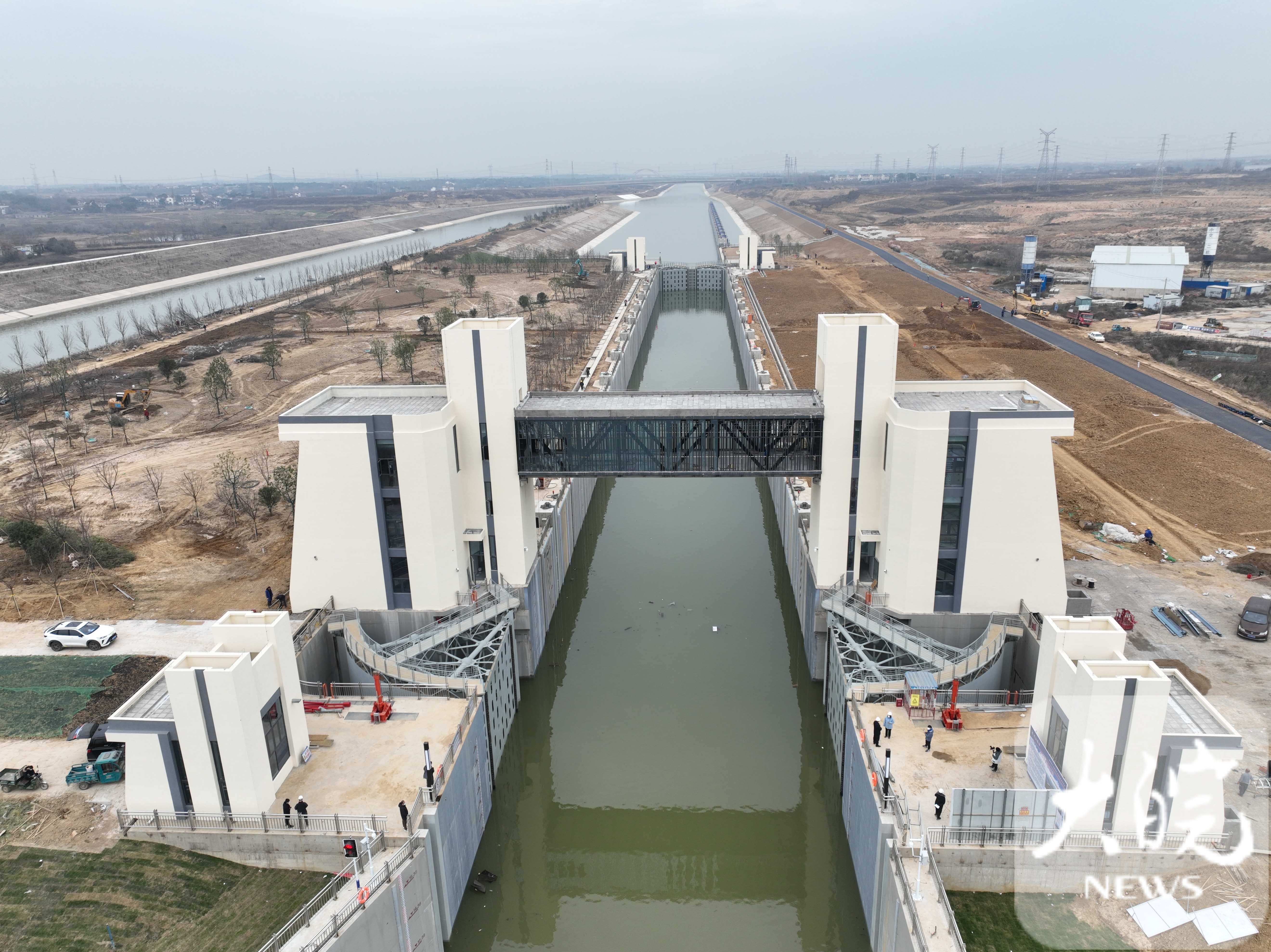 李金冰向大皖新闻记者介绍,庐江船闸等级为Ⅲ级,采取“直线进闸、曲线出闸”方式,设计通行1000吨级船舶,兼顾2000吨级船舶,目前船闸已经建成并完成有水联调联试,堤顶道路养护和绿化施工正在进行。