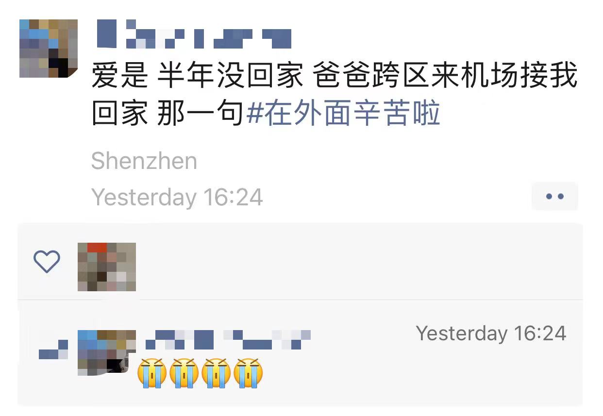 腊月二十八,伊冯(化名)终于从北京飞回深圳过年,一出登机口,爸爸已经等在那里,“在外面辛苦了”,这是爸爸接到她的第一句话,这让半年没回家的伊冯(化名)瞬间觉得被温暖包围。