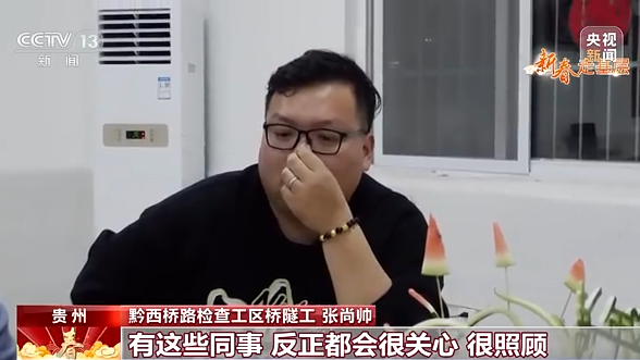 黔西桥路检查工区桥隧工张尚帅:东北到西南是中国一条对角线,路途会很远,搞不好饮食和生活都不习惯,但是在这个大家庭里边,有这些同事,反正都会很关心,很照顾。我只想对家人说,我在贵州很好,你们也不要担心。
