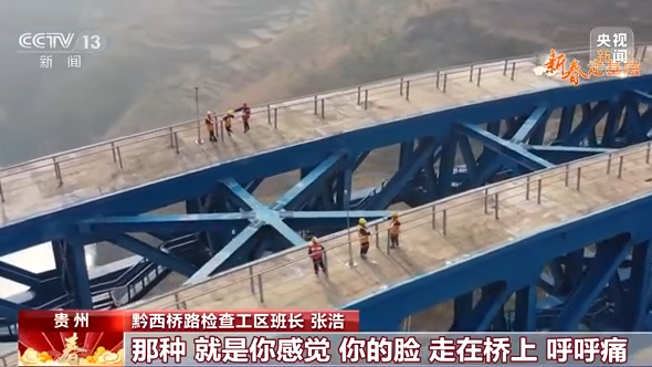黔西桥路检查工区班长张浩:遐想一下,自己站得这么高,看的风景,江山如此多娇,贵州这边也有凝冻天气,下点小雨,你会感觉脸呼呼疼,就是感觉有人在抽你嘴巴子一样。