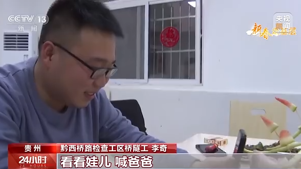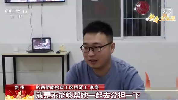 黔西桥路检查工区桥隧工李奇:感觉很不是滋味,就是不能够帮她一起去分担一下。家里面过年,家里面都在吃好的,但是她在坐月子,只能吃一些清淡的。