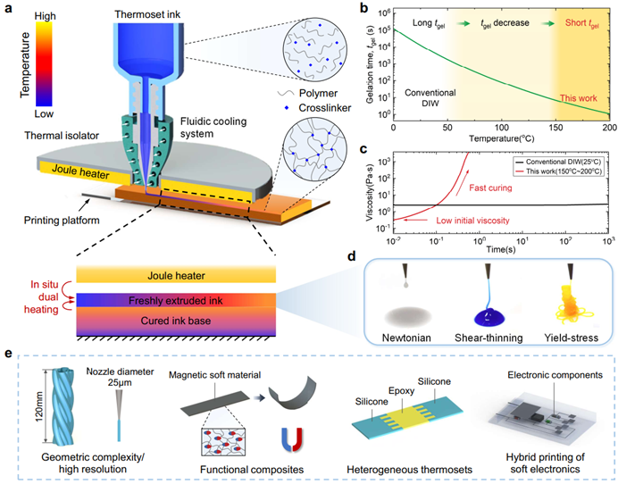 热固性材料在交联后形成三维空间网络结构,具有非常优异的力学性能和稳定性。近年来,热固性材料在软体机器人和柔性电子等领域扮演着愈发重要的角色。新型软体机器人对复杂结构与功能性提出了更高的需求,面向其开发一种简单、普适、廉价的热固性材料制造方法具有重要的意义。然而,热固性材料的3D打印仍然存在诸多限制,如固化原理、材料的流变性和成型效率等。