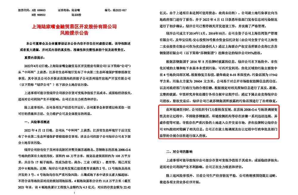 对于项目停摆,上海陆家嘴公司曾发布公告称,股权交易后,绿岸公司已就苏钢集团所披露的污染范围进行了治理修复。另核查发现,在苏地2008-G-6号地块调规变性及出让过程中,不排除苏钢集团、环境检测机构等存在涉嫌一系列违法违规、弄虚作假等可能,导致存在严重污染的土地进入公开交易市场,并在挂牌转让绿岸公司95%股权时隐瞒了相关信息。