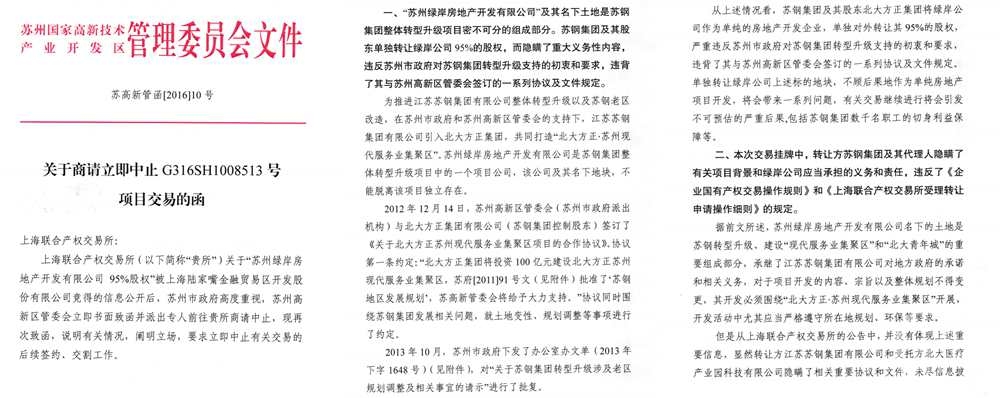 85亿元拿下土地的消息还没降温,2016年10月18日、19日,上海联合产权交易所连续收到了苏州高新区管委会两份《关于商情中止项目交易的函》。据上游新闻记者获取的该函件内容显示,2016年8月29日,上海联合产权交易所发布了江苏苏钢集团有限公司(以下简称苏钢集团)委托北大医疗产业园科技有限公司向上海联合产权交易所提交转让苏钢集团全资子公司苏州绿岸房地产开发有限公司(以下简称绿岸公司)95%股权转让的公告。苏州高新区管委会发现后立即约谈苏钢集团及北大方正集团有限公司相关负责人,要求其停止有关股权的挂牌,但2016年10月17日获悉,已被摘牌,因此发函要求中止有关交易的后续签约、交割工作。