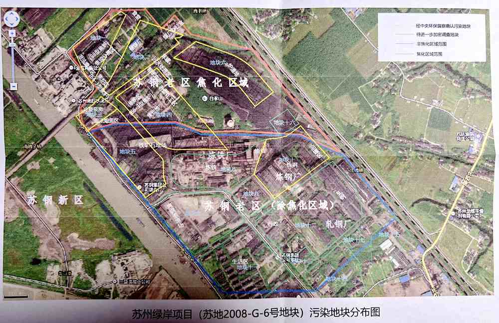 据上游新闻记者获取的苏州绿岸项目污染地块分布图显示,经中央环保督察组确认的污染地块主要分布在苏钢老区焦化区,非焦化区地块被确认的污染地块原用途为炼钢厂。