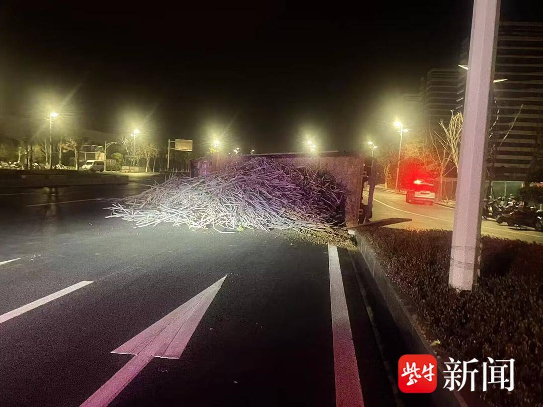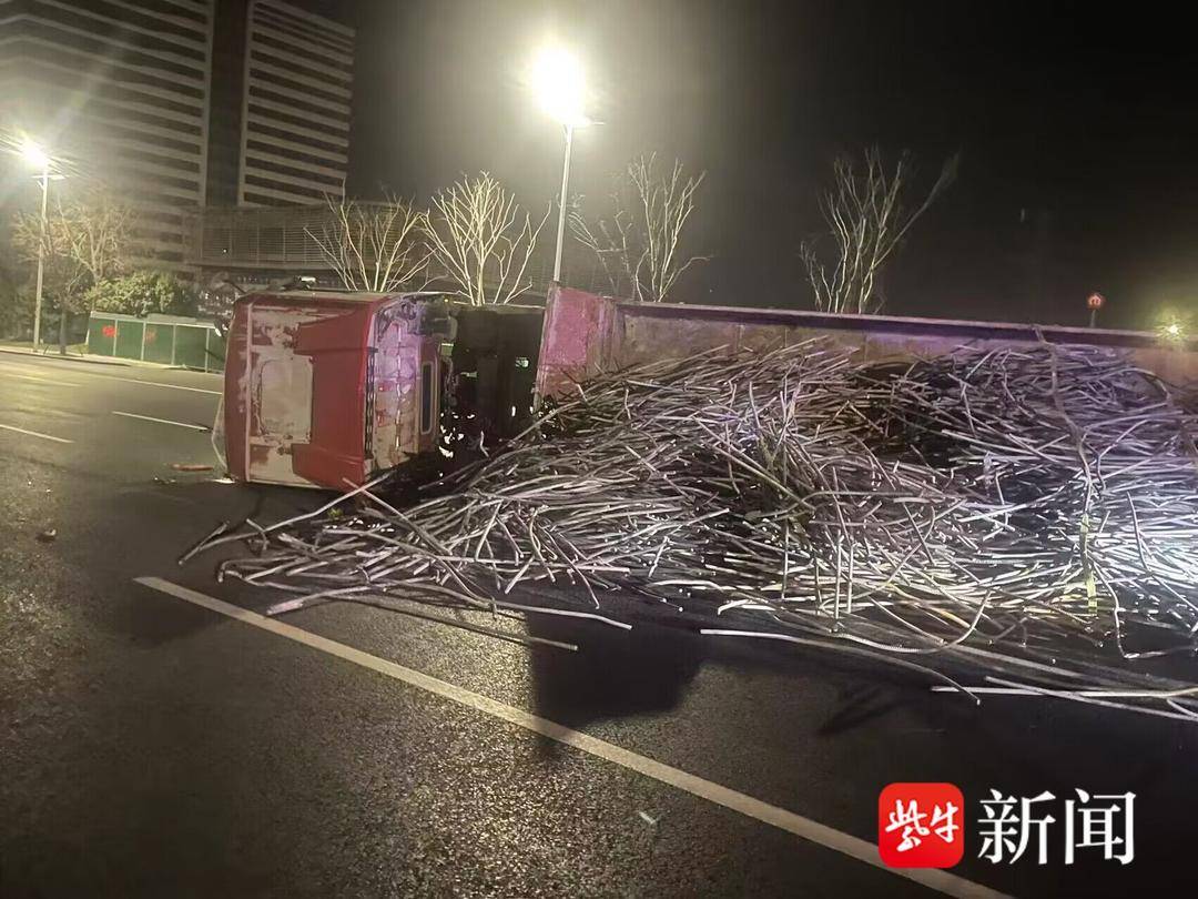 江宁开发区交警中队民警赶至现场,发现一辆大型货车侧翻在马路中间,车上装载的是拆除下来的钢筋,因货车侧翻,这杂乱无章的钢筋散落了一地。