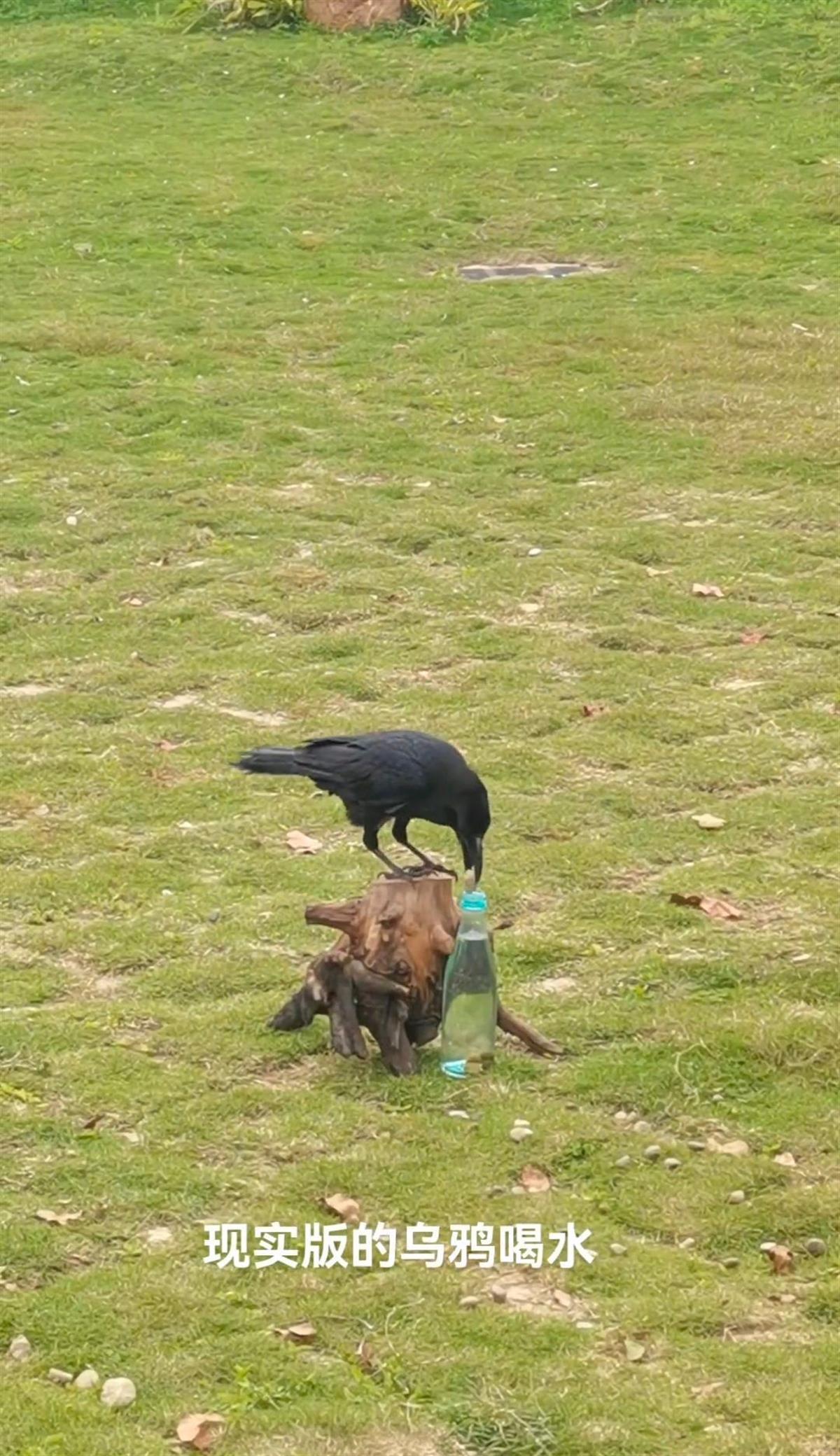 在网友发布的视频中,一只乌鸦衔着石子,站在木桩上,一粒一粒将石子丢进木桩旁的水瓶里,投完还要尝试一下能否够到瓶中的水。遇到比瓶口大的石子,乌鸦还会丢掉,再重新捡其它合适的石子来填进水瓶。不少网友惊呼:“原来课文中的《乌鸦喝水》是真的。”