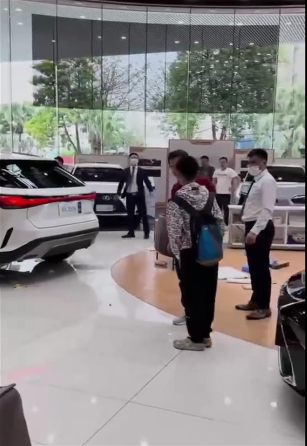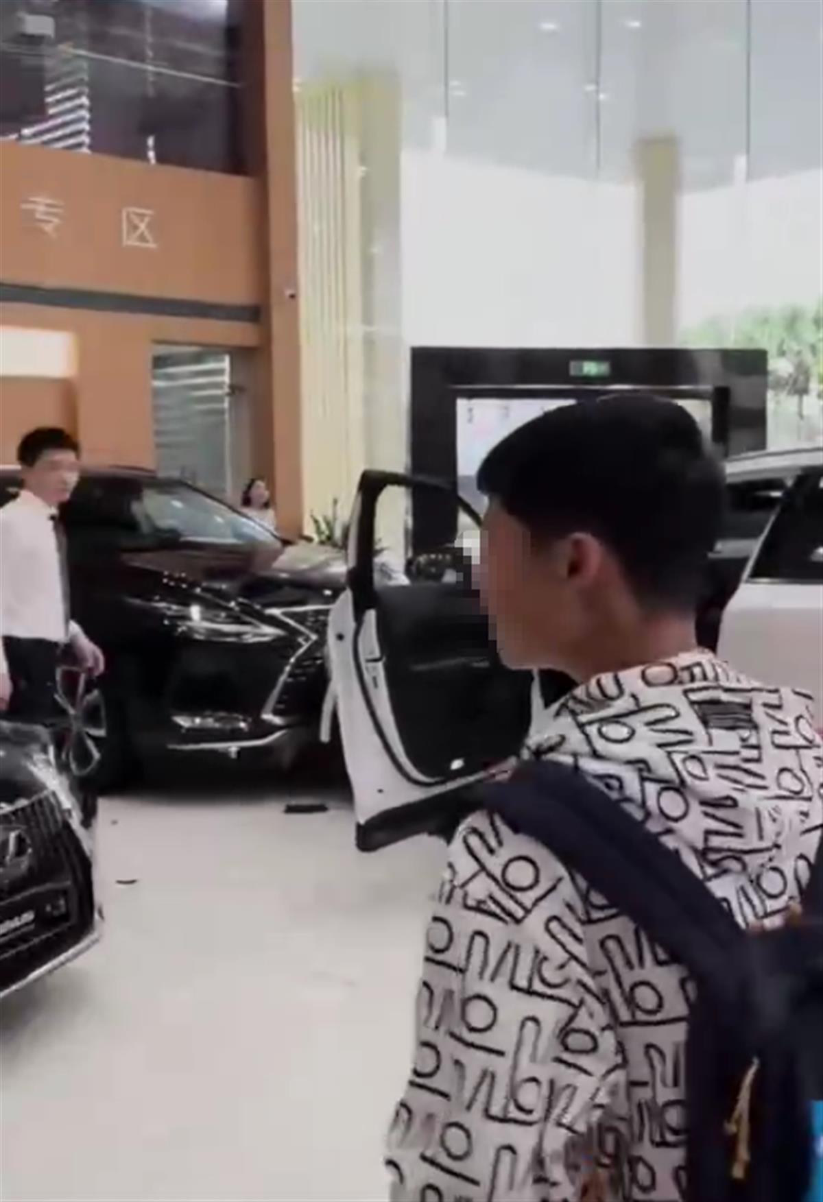 现场视频显示,4S店展厅内,一辆白色雷克萨斯新车和一辆黑色新车迎头相撞,旁边还有另一辆黑色雷克萨斯新车的右前门处也被撞损,现场一片狼藉。一名男孩在现场,旁边一名穿红衣的男子疑似其家长。