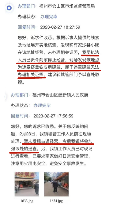 澎湃新闻注意到,2月27日当天,福州仓山区生态环境局、城市管理局、市场监督管理局和建新镇政府分别对上述情况在12345便民平台进行了答复。