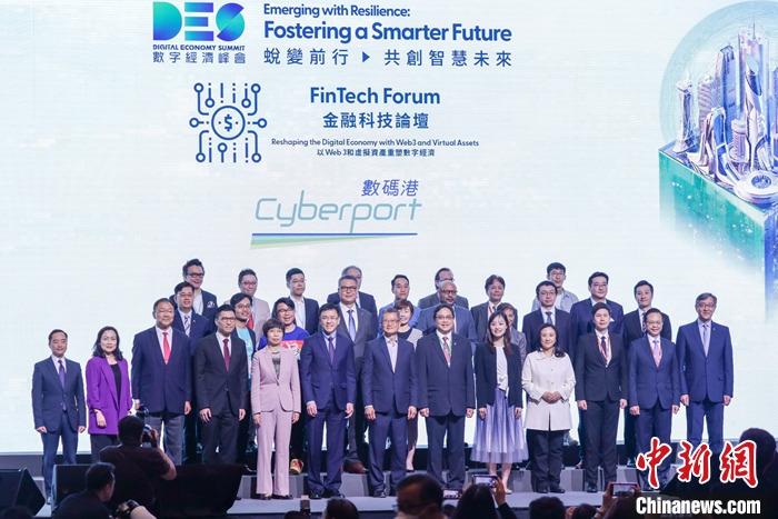 资料图:4月14日,2023数字经济峰会“金融科技论坛”在香港会议展览中心举行。图为与会嘉宾合照。 中新社记者陈永诺摄