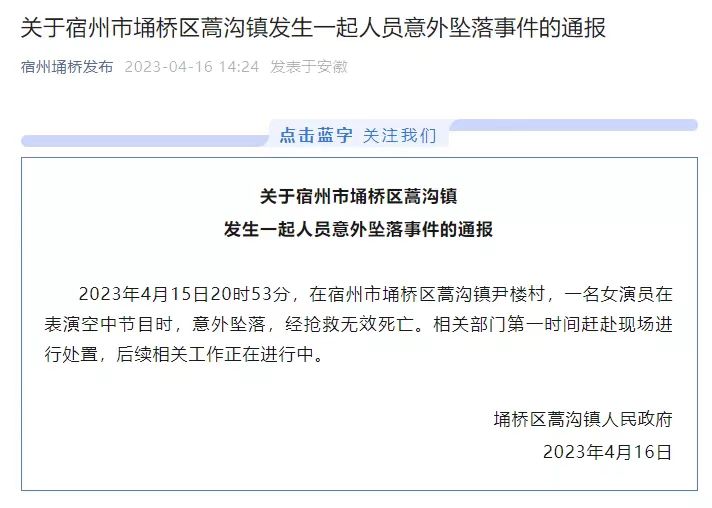 4月15日晚间,安徽宿州市埇桥区蒿沟镇尹楼村一表演现场,两名演员高空表演时,女演员坠落。演出公司回应称夫妻演出前因吵架没系安全扣,对此该名女演员的丈夫张先生在接受采访时予以否认。其间原委仍需多方调查,但女子的死却是血淋淋的事实。