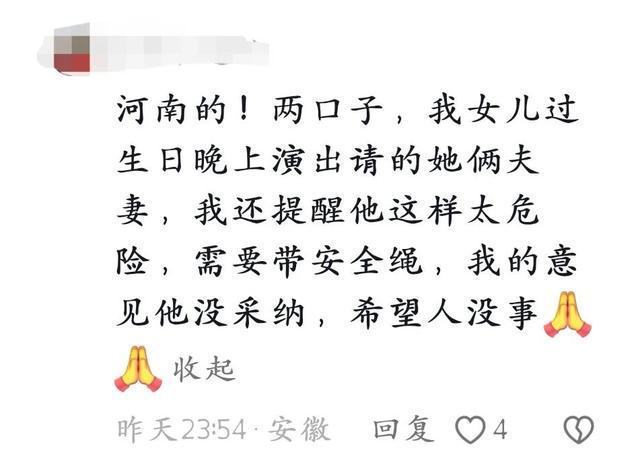 同时,也有有网友表示,如果丈夫真的明知道妻子没扣安全扣,还让其升空表演,那就要深入调查一下了!对此,您怎么看?