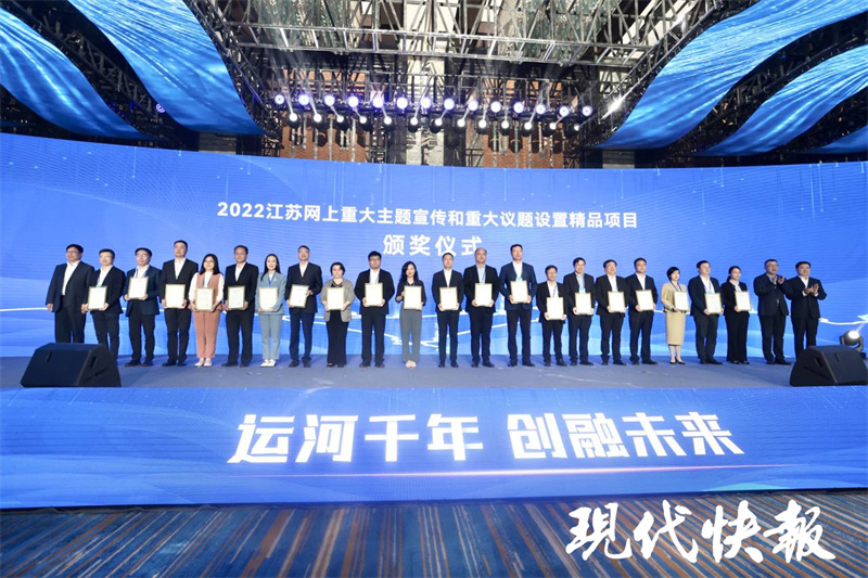 随后,2022江苏网上重大主题宣传和重大议题设置精品项目颁奖仪式举行。经过专家评选,共有18个项目获奖。这些项目主题鲜明、时代感强,充分展现了江苏经济社会发展成就,汇聚起网上网下奋进新时代、谱写“强富美高”新江苏现代化建设新篇章的磅礴力量。