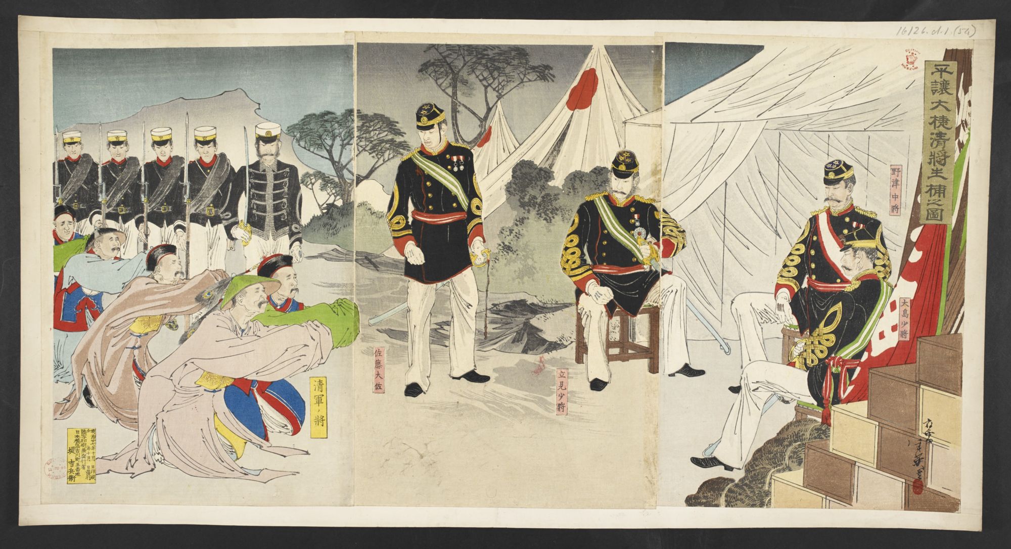 在波士顿美术博物馆(MuseumofFineArtsBoston)官网上,记者搜索到被引用的那副“丁汝昌投降图”。该展画的题记为“威海卫沦陷后中国北洋舰队司令员丁汝昌投降”,作者和出版商均为日本人,出版于1895年。