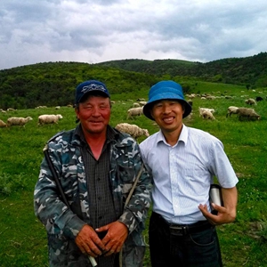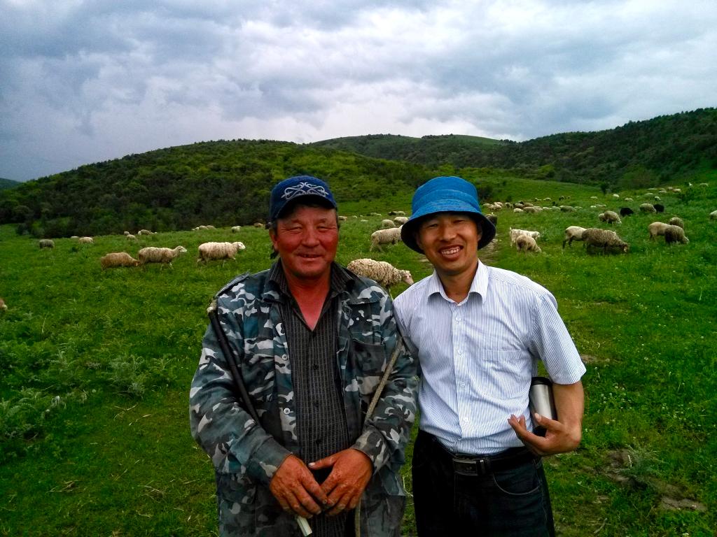 2017年,陕西省考古研究院赴哈萨克斯坦考古队现场负责人丁岩与哈萨克斯坦牧羊人合影。(受访者供图)