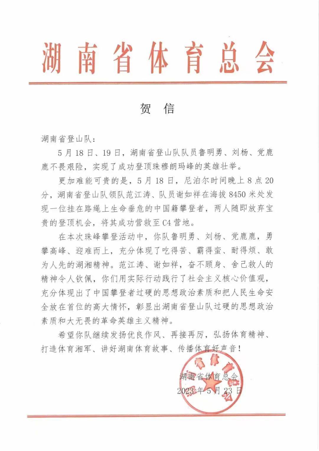 对此,湖南省体育总会向湖南省登山队发出贺信,祝贺几名队员实现了成功登顶珠峰的英雄壮举,同时对范江涛和谢如祥两名队员的救人义举给予了高度赞扬。