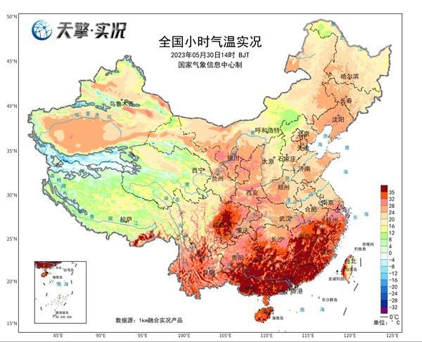 真的太热了!今天下午14时气温实况图看,南方真的热翻了天↓