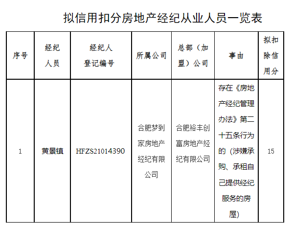 黄景镇,所属公司:合肥梦到家房地产经纪有限公司,存在《房地产经纪管理办法》第二十五条行为的(涉嫌承购、承租自己提供经纪服务的房屋),拟扣除信用分15分。