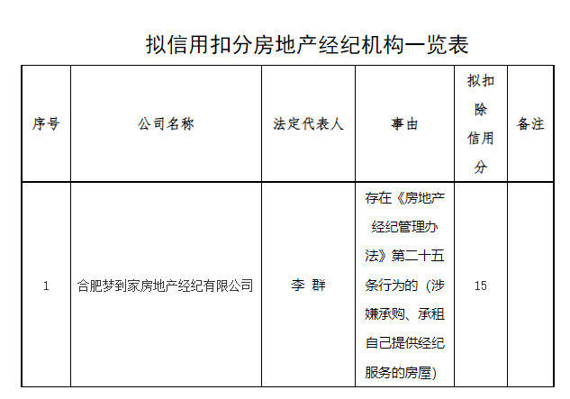 据公示,合肥梦到家房地产经纪有限公司,存在《房地产经纪管理办法》第二十五条行为的(涉嫌承购、承租自己提供经纪服务的房屋),拟扣除信用分15分。