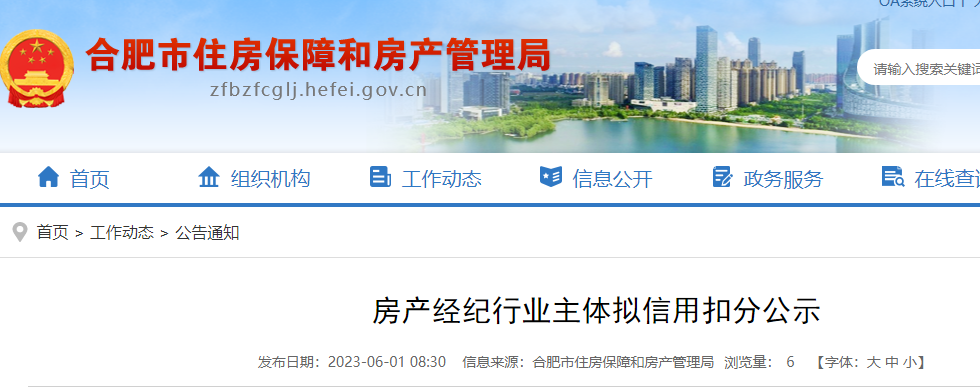 大皖新闻讯 6月1日,合肥市住房保障和房产管理局发布房产经纪行业主体拟信用扣分公示。