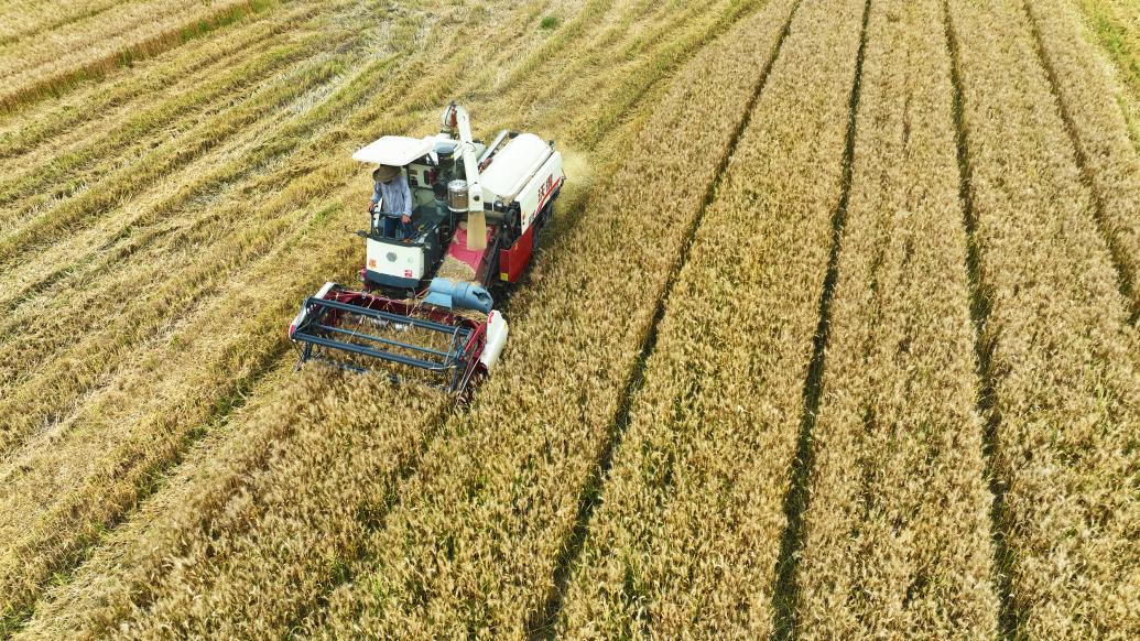 2023年5月30日,安徽马鞍山,一台收割机来回穿梭,当地农民正抢抓农时收割小麦。视觉中国图