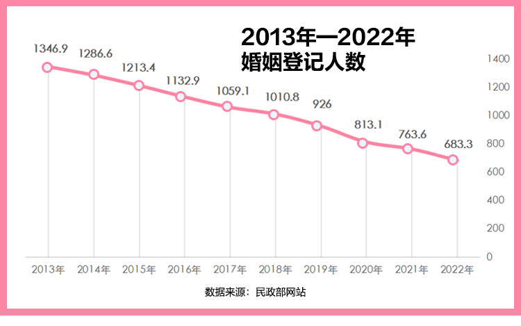 从民政部历史数据来看,2014年起,结婚登记数量连续9年逐年下滑,2019年、2020年、2021年、2022年分别跌破1000万对、900万对、800万对、700万对,其中,2020年的下降数量达到113万对。
