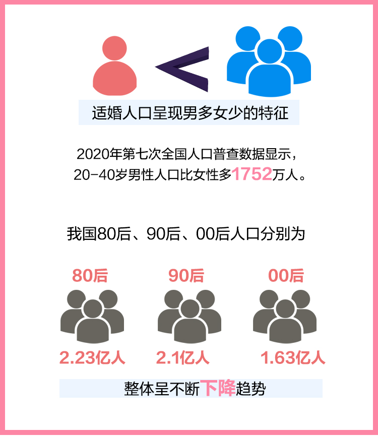 中国人口学会副会长、南开大学经济学院人口与发展研究所教授原新表示,性别结构失衡问题对初婚人数降低亦有影响。适婚人口呈现男多女少的特征。2020年第七次全国人口普查数据显示,20-40岁男性人口比女性多1752万人。