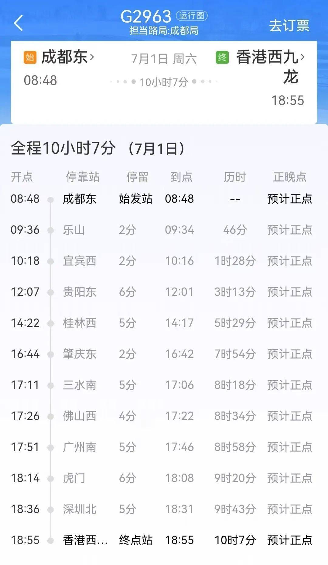 成都往返香港高铁列车由中国铁路成都局集团有限公司成都客运段担当值乘任务,列车将途经乐山、宜宾、贵阳、桂林、广州、深圳等城市,全程运行时间约10小时。
