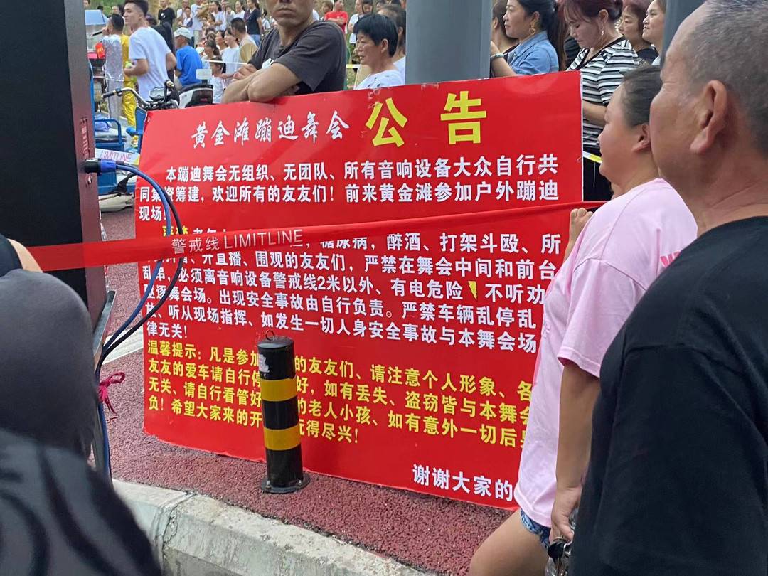 这些组织者大多是自发组织和自我管理,没有专业的安保或医疗人员。以现场一份标明“黄金滩蹦迪舞会”的公告为例,提醒现场蹦迪的人群注意个人形象,照管好老人和小孩,发生丢失和盗窃的情况与该舞会无关。