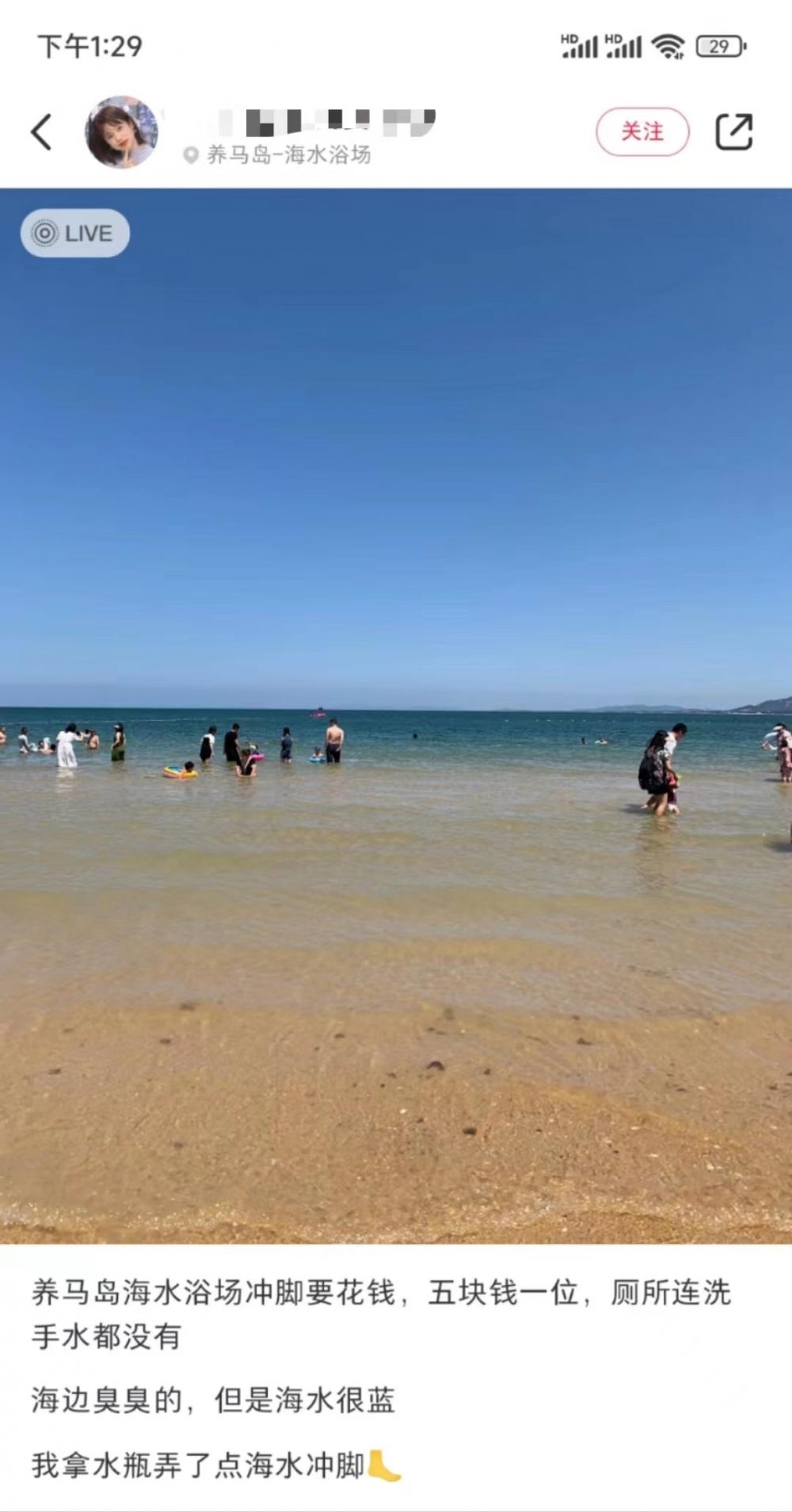 近日,有网友在某社交平台上发帖吐槽,称烟台市养马岛海水浴场冲脚要花钱,“五块钱一位,厕所连洗手水都没有,我拿水瓶弄了点海水冲脚。”在这条帖子的评论区,也有不少网友参与了讨论,“金沙滩附近全是免费冲脚的地方,只有养马岛海水浴场不仅冲脚收费,还把公厕的水停了”“为了让交钱冲脚,厕所连洗手池都不给水,外面公共的水管全部封死,吃相不要太难看”……