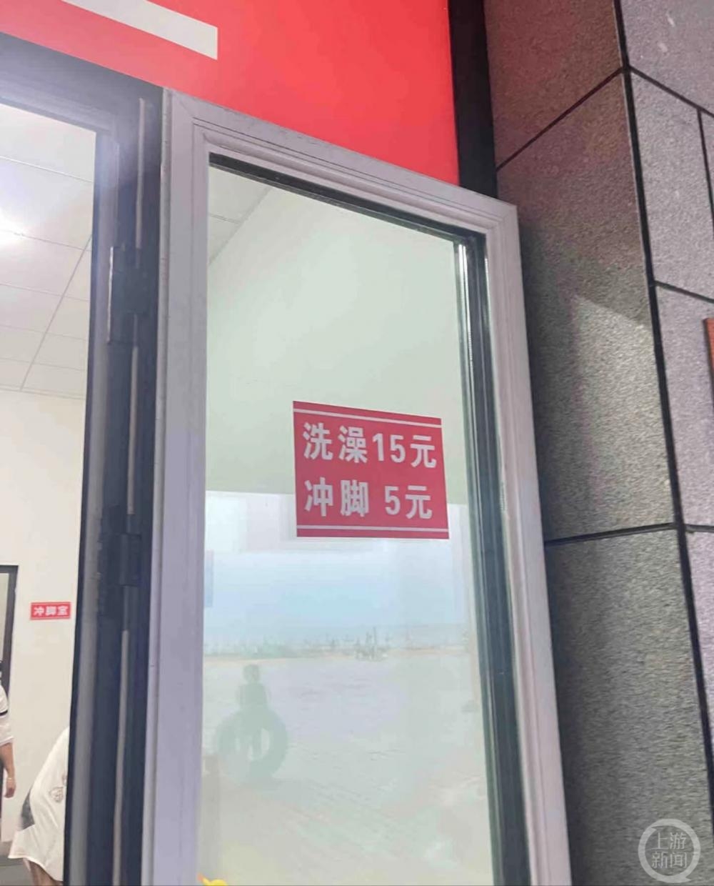 上游新闻(报料邮箱baoliaosy@163.com)记者在评论区看到,不少游客都觉得这样的收费标准有点贵。一名IP显示为黑龙江的网友表示:“这事我有发言权,前几天刚去过,男女卫生间所有的水龙头没水洗手,旁边洗脚花钱。只有那个需要用水的景点没有水,别的景点都有,挺没意思的。”另外一名网友还晒出了该海水浴场的收费标准,上面写着“洗澡15元,冲脚5元”。他还留言表示:“被震惊到了,厕所水池故意关掉,整个厕所的味道……洗手没法洗,一墙之隔的冲洗室,洗澡15元,冲脚5元,这吃相。”