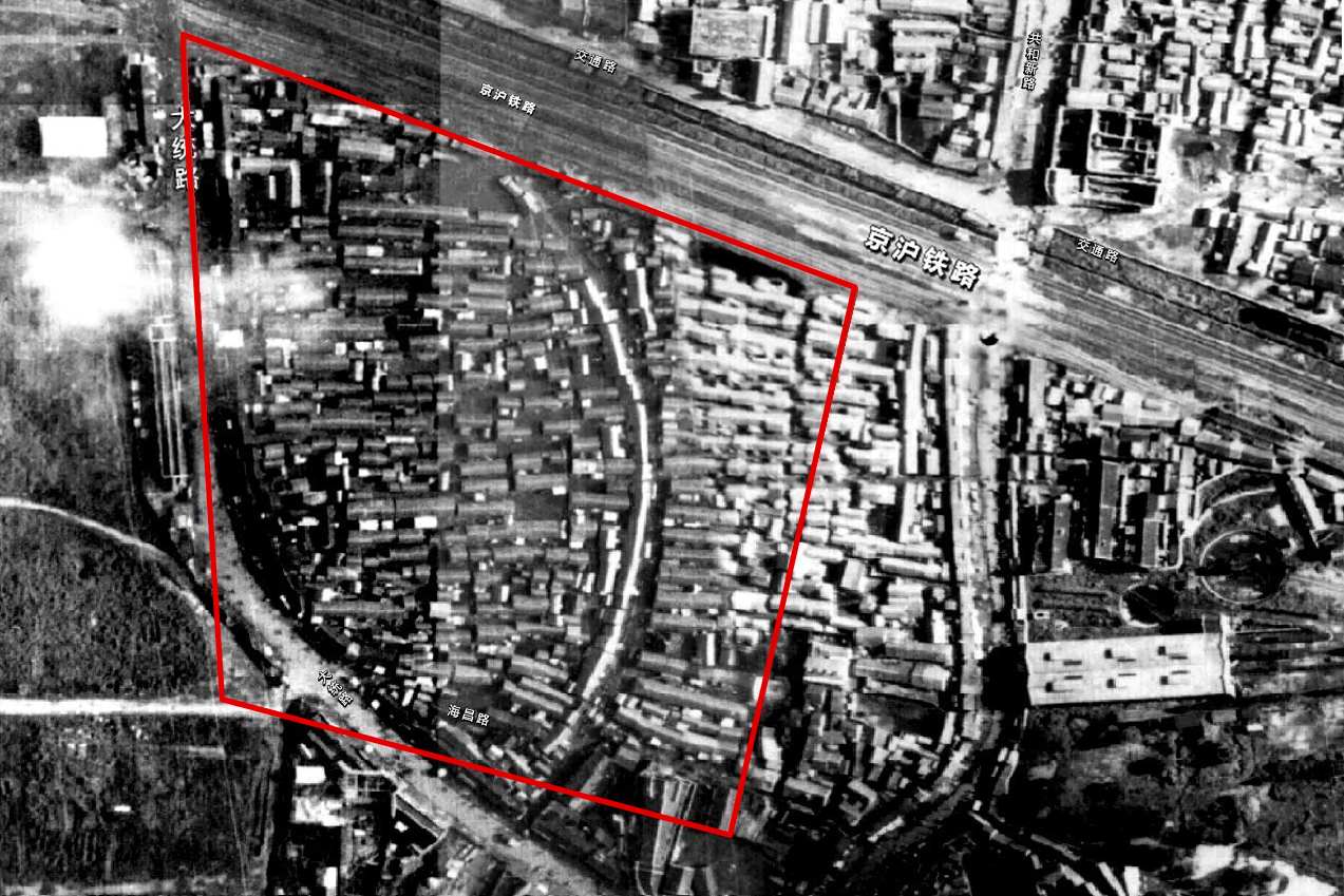 俯瞰1948年的蕃瓜弄地区。红线范围内为今日蕃瓜弄的大致区域。图片来源网络