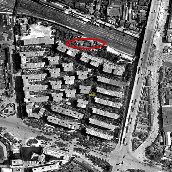 俯瞰1960年代改造后的蕃瓜弄。红圈处是当时保留的“滚地龙”展示区。图片来源网络